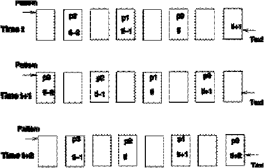 シストリックアレイの最も簡単な例が図1に示すパターンマッチ用のアレイである。この例ではセルは一次元に配列され、各セルは1文字の比較を行う。図に示すようにアレイの一端からはテキストを、他の一端からはマッチするパターンを入力すると、各セルは並列に比較を行い、一回パターンとテキストを流してやれば、全照合が終了する。各セルは1クロックごとに「比較動作」とアイドルを繰り返しており、これがシストリック的な動作である。