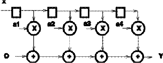 シストリックアレイは、交信が完全に局所的に行われること、セルの規則構造、並列、パイプライン処理の利用、入出力と計算のバランスの点で先の条件を良く満足している。しかし、すべての応用分野についてこのようなアルゴリズムを構築することは難しい。そこで、シストリックアレイにグローバルバスを付加したセミシストリックアレイも研究された。この構造によりFIRフィルタ等の分野にも適用が可能になる。図3は一種のグローバルバスを持ったFIRフィルタのセミシストリックアレイによる実現例を示す。