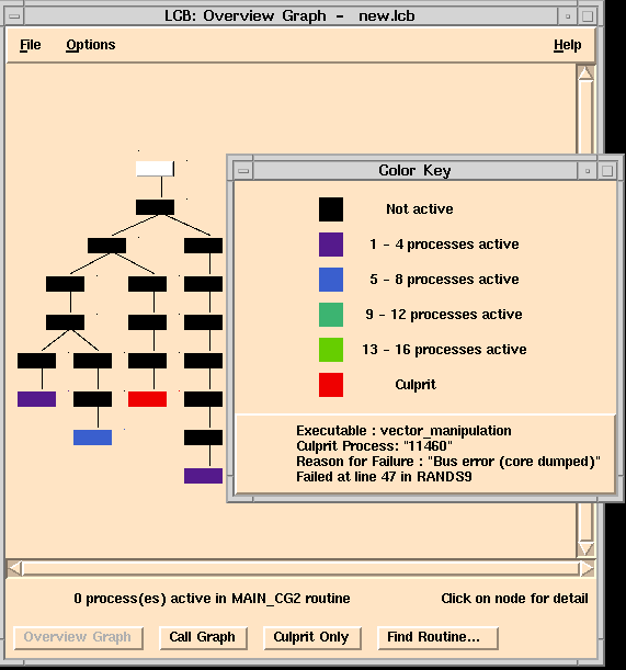 異常終了時の複数プロセスの制御がどこにあったかを手続きのInvocation Tree上で示している。制御があった手続きが、そこにいたスレッドの数に応じて色分けして表示される。(http://www.ptools.org/projects/lcb/demo/ から引用)