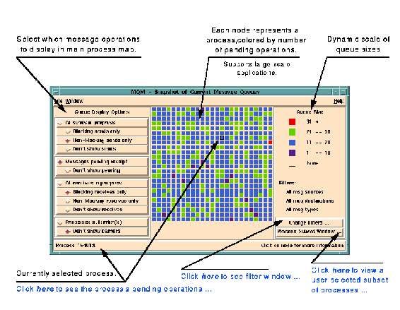 中央のそれぞれの四角は各プロセッサのメッセージバッファを示し、キューにたまっているメッセージの数で色分けされている。メッセージタイプや送信プロセスなど、種々の情報によりフィルタリングすることができる。またそれぞれの四角をクリックすることによりキューの中身のデータを表示することができる。
