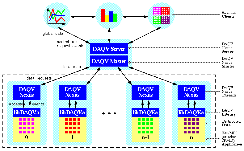 一番下の各プロセッサにおいてMPIなどで利用される分散配列(ローカルイメージ)の全体構造をDAQV Masterで管理し、グローバルイメージでのClientからのデータ可視化要求に答える。