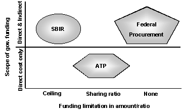 (1)政府調達、SBIR、ATPの費用負担スキーム これら3つのシステムの費用負担は以下のようになっている。