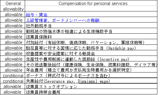 CAS/FARの下でのCost-reimbursement契約(直接費用・間接費用ともに政府負担)において賦課が認められる費用のうち、特にソフトウエア開発で大部分を占める人件費関連の費目内容は次ページの表のようになっている。大変広範囲の費用が算入可能となっている。