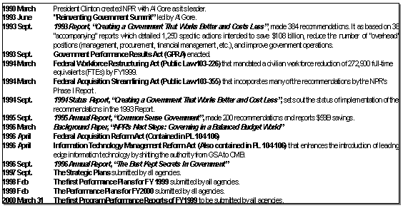 クリントン政権のNPR以前にも、米国には「業績重視の予算を推進するプラン」が4つも存在した。しかし、今回のNPRはその中でも最も長期に継続しており、達成度も最も高いと考えられる。