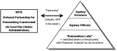 Performance Budgetingを実施するにあたり、その実行部隊としてReinvention Laboratory(刷新の実験室)なるチームが各省庁の前線の職場に設けられた。1998年現在でその数は325を越えたとされる。これらの「実験室」は、民間企業のQCサークルにも似たチーム指向のボトムアップ戦術であるが、QCサークルに無い強力な武器が存在する。それが各省庁規則やFARからの必要に応じた「Waiver(免除)」の権利である。