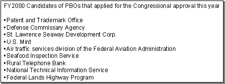 PBOは、1996年に創設されたNPRの連邦政府の予算及び業務遂行をマネージする概念である。議会が、省庁から申請のあった特定の部署をPBOとして認定すると、その部署の長は連邦調達規則や人事規則からの広範な免除を受けることができる(逸脱が裁量で認められるようになる)。その代償として、その部署は厳しい業績評価を受けることになる。しかしながら、議会はこれまでこの制度をあまり重要視しておらず、FY2000以前のPBO申請は無視されつづけていた。ようやく2000年度から少し動きが出てきた。