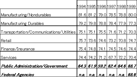 民間とのシームレスなベンチマーキングをさらに徹底するため、連邦政府はミシガンビジネススクールによって開発された顧客満足度指標を採用、1994年から民間企業と全く同列の基準によって各省庁のサービスに対する顧客満足度を測定し始めた。