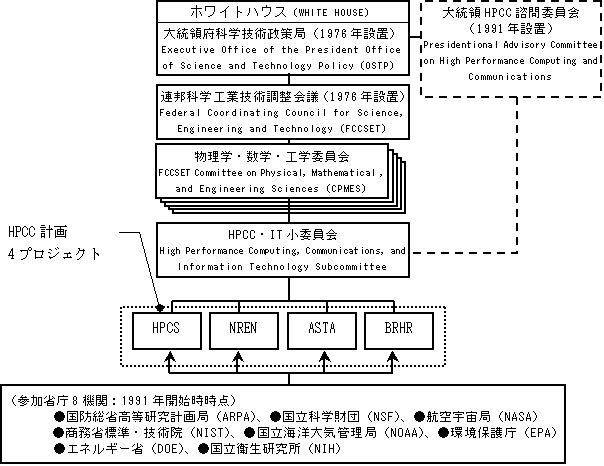 また、前頁の(HPC-R1)で示した通りARPA(現在のDAPRA)に対しても協力を要請している。(HPC-P2)の省庁間の協力とは、これら協力を要請した省庁間で協力して4プロジェクトを進めることを指している。なお、実際に、HPCC計画当初からプロジェクトに参加していた省庁は、NSF、NASA、DOE、NIST、NOAA、EPA、ARPAに加え、国立衛生研究所(NIH)の計8機関である。なお、EDは92年度からHPCC計画に参加している。HPCC計画開始当初の実行体制は図表に示す通りである。なお、1992年9月には、HPCCイニシアティブを支援するために、NCO for Computing, Information,and Communicationsが設置された。