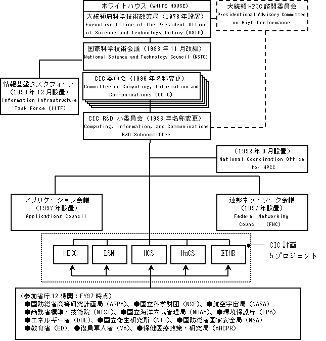 96年度までで実施されたHPCC計画が成功を収めたのを受け、HPC法案失効後の継承計画として開始された。なお、CIC計画について、HPCC計画のときのHPC法のような立法措置は取られていない。CIC計画では、プロジェクトが次のように編成された。