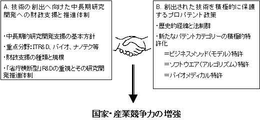 米国におけるIPRの先行取得と商業化促進政策のベースとなるのは、1)IPRのシーズである技術そのものの創出を促す中長期的研究開発支援のスキームと、2)それら技術の排他的所有権を早期に確立して国際的産業競争力の源泉として活用をもくろむ「プロパテント政策」である。