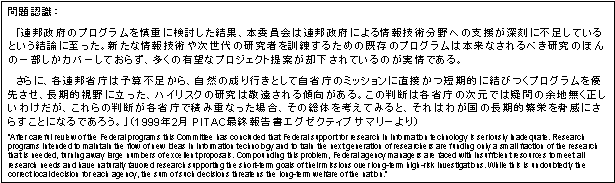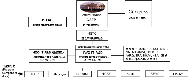 クリントン政権はIT研究開発を中心として、「短期的成果(省益)に傾斜しがちな各省分離型でなく、中長期的成果を重視する省庁横断型R&Dを積極推進する方針」を標榜し、国家的支援を増強してきた。それはPITAC(大統領情報技術諮問委員会)の示した問題認識にも如実に現われている。
