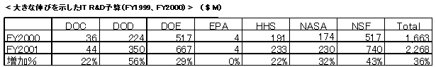 上記の問題意識の下、IT関連R&D予算はFY2001にさらに増強された(下表)。