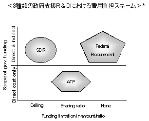 「IT R&D」(IT2+HPCC+ASCI)が中長期研究開発の中心に位置することに変わりはないが、それ以外にも、ハイリスク研究開発の母体としてDOCのNIST傘下のATPや、SBAのSBIRがある。だが、SBIRは基礎研究でなく製品開発支援という性格も強い。これらのR&D支援スキーム毎に、費用負担の構造も異なる。