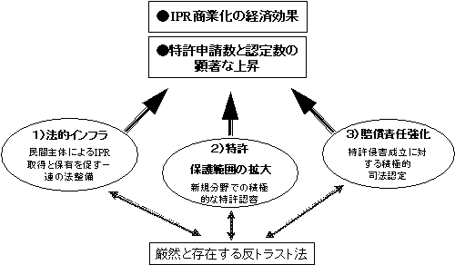 プロパテント政策とは、実質的に1)民間主体によるIPR取得と保有を促す一連の法整備、2)新規分野への積極的な特許保護範囲の拡大、3)特許侵害成立に対する積極的司法認定で構成される。