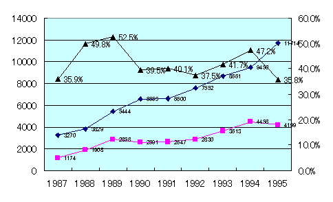 <特許クラス364・395合計の申請数、特許数、認可率>