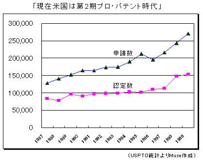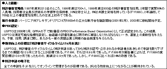 前頁のグラフに見るように、プロパテント政策の下で特許申請数が急増している。この事態を受け、USPTO(米国特許庁)は1)特許サイクルタイムの大幅短縮、2)大量の特許申請を厳格かつ迅速に処理する体制造りをめざしている。政府業績結果法(GPRA)の下、「あたかも営利企業のような」高効率の運営を目指しながら、増員・床面積拡張等、矢継ぎ早に業容拡大が進んでいる。USPTOが政府組織として存在感を強めている。