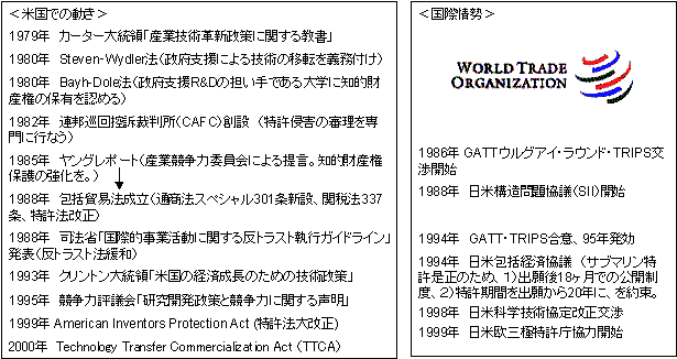 レーガン政権成立(1980年)の直前、カーター政権の「産業技術革新政策」を契機として、米国は独禁法強化による特許冬の時代といわれたアンチ・パテント政策から転換、知的財産権保護の強化によるプロパテント政策を推進し、民間主体によるIPR取得と保有を促す一連の法制を整備してきている。