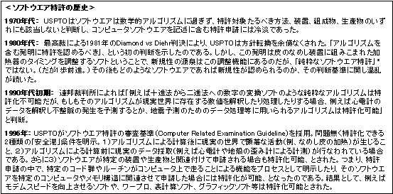 いわゆるソフトウエア特許(アルゴリズム)は、プロパテント政策の下で実質的に特許化可能な領域として認知されている。