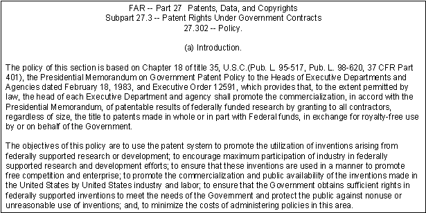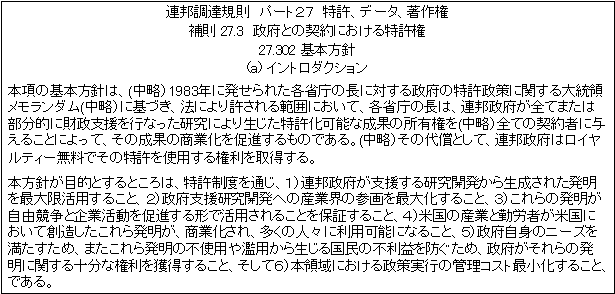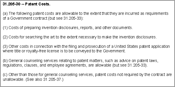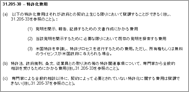 特許化費用の負担に関するルールは、連邦調達規則(FAR. Federal Acquisition Regulations)パート31に詳細に定められており、事実上政府との契約で生じる限りにおいて賦課することができる。