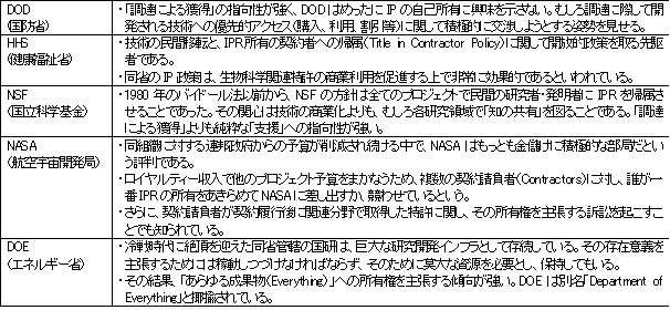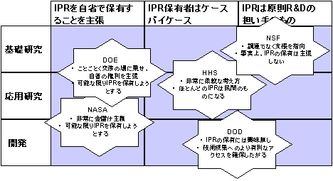 政府支援研究開発におけるIPR帰属に関する「原則」は上記の通りだが、 MUSE 1998年報告書「欧米の研究開発プロジェクト、支援制度、調達における知的財産権の取り扱い」にあるように、各省庁のミッションやそれに基づく研究内容の性質(基礎研究、応用研究、開発)の違いにより、IPR帰属に対するスタンスが異なっていることに留意すべきでる。
