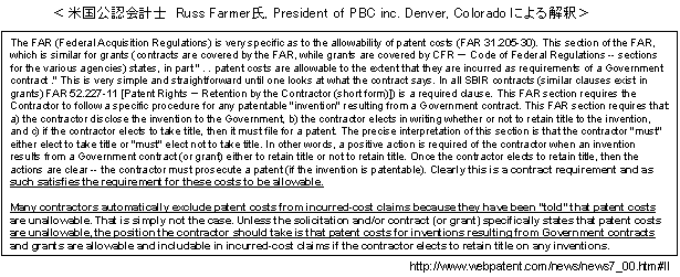 もっとも、現実には各省庁には特許化費用負担に関する明確なポリシーは存在せず、実際上個別の契約を監査するCPAが裁量を持つ場合が多い。CPAの中には口頭で「特許化費用は賦課できない」と指導したり、コントラクターの中には自主的に賦課しない者もいる。だが、それらはFAR上誤りであり、あくまでも特許化費用は法的には賦課可能である。以下に示すあるCPAのコメントは、米国における特許化費用のFAR解釈である。さらに、先に述べた賦課の実態についても触れている。
