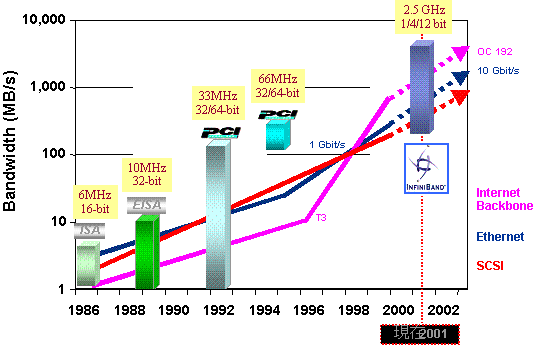 サーバコンピュータに要求されるI/O性能は、年々着実に上昇している(図1参照)。そして、I/Oをコンピュータにつなぎ込むところは、I/Oバスが受け持っている。これまでISA、PCI等がサーバで使われているが、I/Oに要求されるバンド幅は年代と共に急速に増大しており、66MHz x 64bitのPCIをもってしても不足し始めている。それを越える仕様として、InfiniBandが提案されている。
