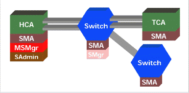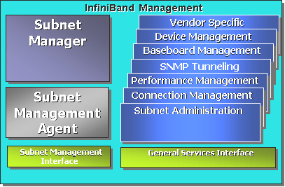 InfiniBandでは、インバンドで Unreliable Datagram を使ってマネジメントを行なう。マネジメント用のパケットをMAD(MAnagement Datagram)と呼んでいる。 HCA、TCA、およびスイッチは、すべてMADを処理するエージェントSMA(Subnet Management Agent)を載せていなければならない。各装置で実際の処理を行なうSMAの上にサブネットマネージャがいる。サブネットマネージャは各サブネットにつき1つだが、マスターの他にバックアップがいくつかいても良い。パブリックなルーティング制御などは、このマネージャが行なう。またコネクションを張るときには、コネクションマネージャがサブネットマネージャから必要情報を引き出す(図8参照)。