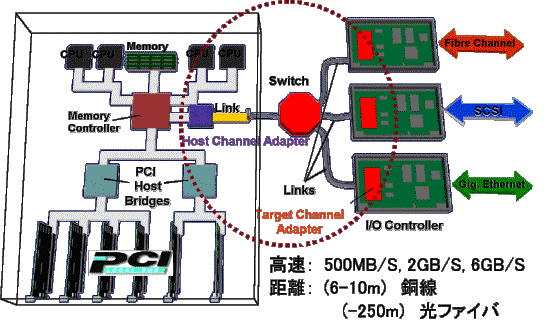 メモリコントローラにはホスト側チャネルアダプタ(HCA)を、一方のI/Oコントローラにはターゲットチャネルアダプタ(TCA)をつけ、両者をリンクでつなぐ。途中にスイッチを入れることによって、1本の線で多数のI/Oコントローラ接続を可能にする。かつ、リンクであるから、I/Oだけでなくホスト間のインターコネクトとしても使用可能となる(図3参照)。