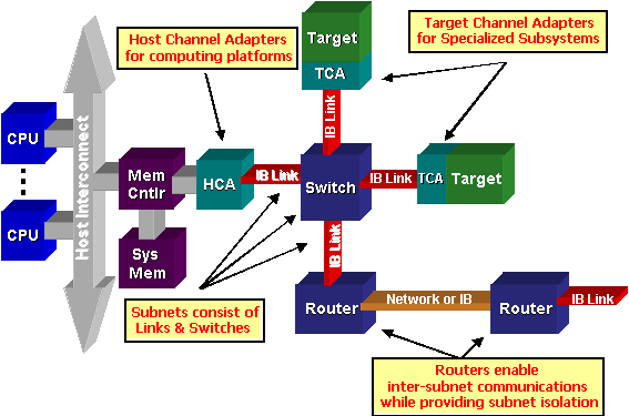 最小のサブネットはスイッチを中心に接続された構成である。HCAは高機能を想定しているが、TCAは安価な物から高価な物まで幅があり、サブセット機能も認める。将来はルータ接続によりサブネットを越えた構成も可能とする。