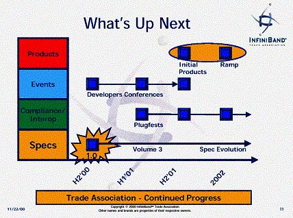 サブネット内のスイッチは単純・安価なものにし、コスト効果比を高めて普及を図る。x1/x4/x12のバリエーションは、将来のスケーラビリティも狙う。既に幾つかの会社はプロトタイプ開発をしており、来年後半にはx1(500MB)の製品サンプルが、2002年にはx4(2GB)が出てくると思われる。