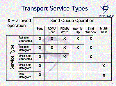 Queue-Pair(QP)が最小の転送実行の単位であり、HCAは複数のQPをハードウェアで実装している。そのオーダーは最小では256、最大で32Kくらいである。QPは、send/receive-queueのペアである。ソフトウェアはQPにsend/receiveを指示し、これを受けてハードウェアが実際のデータ転送を行なう。複数のQPそれぞれにサービスレベルを設定できるので、たとえばディスクI/Oの優先度を落とし、ネットワークI/Oの優先度を上げるなどが可能である。