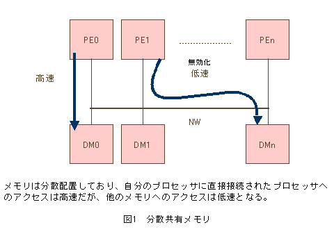 DSM(分散共有メモリシステム)システムとは、物理的に分散配置されたメモリを共有メモリとして構成したシステムであり、論理的にはすべてのアドレス空間を通常のロード、ストア命令でアクセスできる。ただし、物理的には分散配置されているので、図1に示すように、自プロセッサに直接接続されたメモリへのアクセスは高速だが、他のプロセッサに接続されたメモリへのアクセスは低速となる。このようなマシンとしては、スタンフォード大学で研究されたDASH[1]や、商用機としてはSGIのOriginシリーズ[2]、NECのCenju-4[3]などがある。