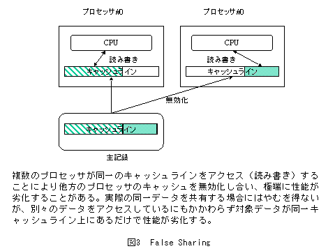 2つ目の問題、False Sharingは、キャッシュの一貫性制御の単位であるキャッシュラインを、複数のプロセッサで同時に利用することにより発生する。キャッシュラインは、32バイトや64バイトなどの単位で管理されるが、この1ラインの中に複数プロセッサがアクセスするデータの境界が来ると、双方の処理で、たとえデータの受け渡しをする必要がなくとも、キャッシュライン単位でデータの一貫性制御を行うために、双方でデータを更新するたびに、他方が保持するキャッシュデータを消し合うことになる。数値計算では、問題の境界部分の処理を目的として、Nの計算領域のために、N+1のデータ領域を確保することが良くある。このような場合にもFalse Sharingが発生することになる(図3参照)。