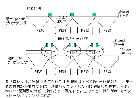 Houston大学のBarbara Chapmanらは、ここまでで述べたAffinity制御によりある程度の高速化は可能だが、16プロセッサ以上の並列実行では、さらなる最適化が必要だと主張している[12]。もっとも確実にAffinity制御を実現する方法は、実は先にも述べた通り、MPIによるプログラミングである。データのプロセッサ間での共有は通信部分に隠蔽できる。この考え方をOpenMPプログラミングに適用する。SPMDモデルにおけるそれぞれのローカルデータ領域は、OpenMPのPrivate変数(スレッドごとに独立に確保される変数)を用いて表現できる。そして、通信バッファ領域としてShared変数を確保しておき、プロセッサ間でのデータの共有をバッファエリアとローカルデータ領域のデータ移送部分に隠蔽するのである。図4に擬似SPMDプログラミングの概要を示す。上の図は通常のOpenMPプログラミングであり、Sharedデータを全プロセッサがアクセスする。それに比べ、下図では、プロセッサごとにPrivate領域を確保し、計算処理では、これだけを用いる。必要に応じて、HPFでいうところのSHADOW領域と同様の袖領域も確保される。Sharedデータは、通信バッファ領域だけであり、プロセッサ間のデータのやりとりは、この領域へのアクセスに押し込めることができる。