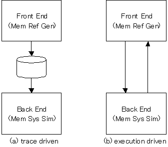 共有メモリ・マルチプロセッサの多くは図1に示すように、トレース駆動型と実行駆動型のいずれかの形態であり、いずれの場合もプロセッサの挙動をシミュレートするメモリ参照履歴を生成するフロントエンドと、それを消費しながらメモリシステムをシミュレートするバックエンドに二分される。各々の形態に固有の高速化技法はもちろんあるが、多くの研究の主眼はいかにフロントエンドのSFを小さくするかにある。逆にいえばバックエンドの高速化はユーザ(アーキテクト)任せであり、研究されていない多くの課題が存在すると思われる。