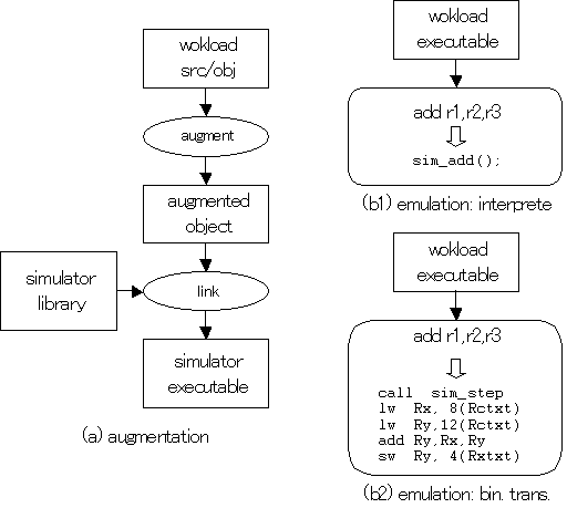 フロントエンドでのプロセッサ・シミュレーションの方式は、図2に示すようにAugmentation方式とEmulation方式に大別される。前者はワークロード・プログラムのソースあるいはオブジェクトに、メモリ参照履歴生成などのためのコードを付加し、それをシミュレータ・ライブラリとリンクして得られる実行形式を直接実行する。これに対しEmulation方式ではワークロードの実行形式を入力し、命令の解釈実行あるいは等価な命令列の実行によりシミュレーションを行なう。