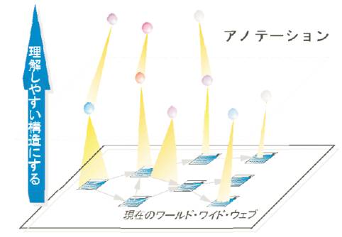 図3.7-2で示されるように、アノテーションは、現在のWebに上位構造を作る基盤になる。現在のWebコンテンツが最下層で、アノテーションはコンテンツに情報を付け加えるメタ(上位)コンテンツ、さらにメタコンテンツに対するメタコンテンツのように階層をなしている。