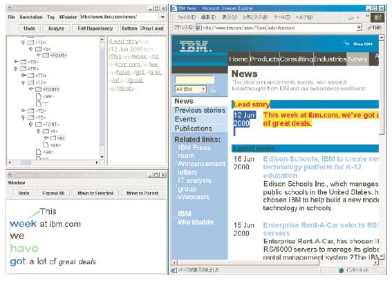 図3.7-3は、アノテーションエディタの画面例である。これは、テキストに含まれる言語構造を自動解析し、その結果を修正するツールである。言語構造をビジュアル化して表示し、簡単なマウス操作で、修正できる。その他の機能として、HTML文書の任意のタグ要素にコメント文を付け加える機能がある。