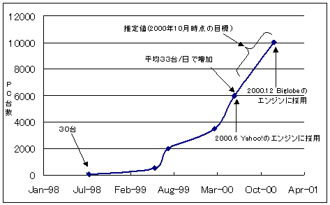 図3.9-2に、Googleで稼働しているLinux PCの台数の推移を示す。当初30台のLinux PCでスタートした後、2000年6月にはトータルで6000台へと増加し、平均33台/日のペースで増え続けている。2000年10月時点での目標は、2000年末までに10000台を達成することであり、正式な報告はされていないが、既に10000台を達成しているものと思われる。