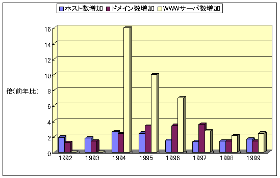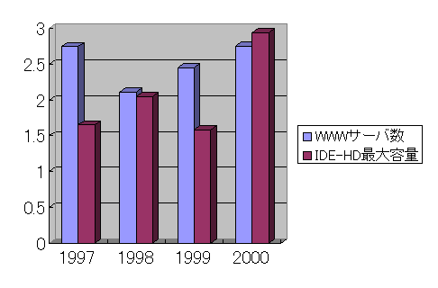 図3.9-4 IDE-HDの最大容量とWWWサーバ数の毎年の増大率 (WWWサーバ数は英国Netcraft社発表のデータ、IDE-HDの最大容量は 米国Maxtor社が販売するIDE-HDの最大容量により計算) |