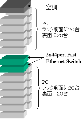 Systtems[15]の技術を用いることによって、1ラックに80台のPCとNetwork