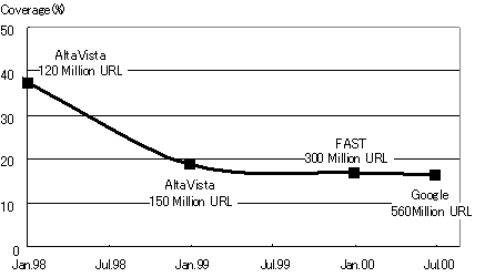 一方で、Googleが持つデータ量も指数関数的に増大している。1999年8月には2億ページであったものが、2000年3月には5億ページへと増大し、2001年2月には、NetNewsの検索サイトであるDejaを買収し新たに5億ページのデータを追加した。これによって、2001年2月末現在では13.5億ページとなっている。