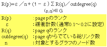 PageRankは、図3.9-9に示す手法で計算する。ページpのランクは、ページpへリンクを持つページqのランクの総和で決定される。ただし、ページqのランクは、ページqが持つ外向きのリンク数(outdegree(q))で割った値となる。例えば、HUB型[23]のWebページからのリンクの重みは小さくなる。εは、論文[1]によれば通常0.15に設定し、他から何もリンクがないサイトに対して0.15のランクを与えている。
