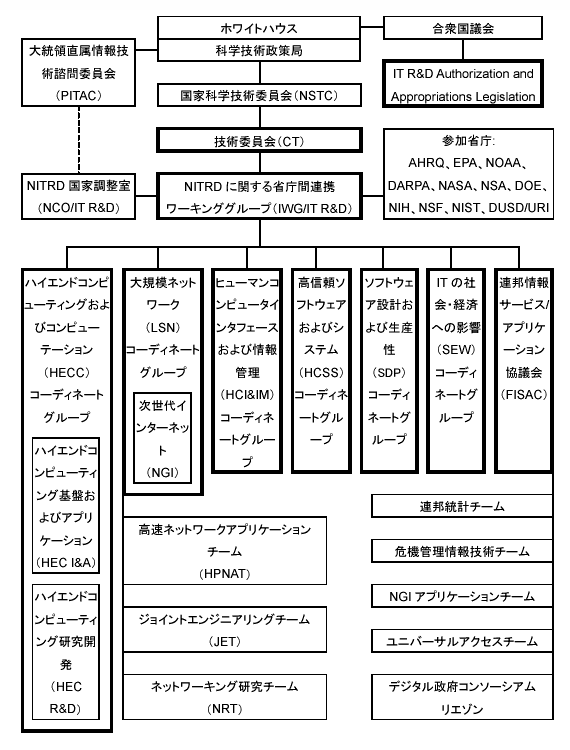 NITRDの計画および執行に関係する組織について以下に説明する(図2.2-1)。組織名称の中では、まだNITRDではなくIT R&Dの呼称が使われている。