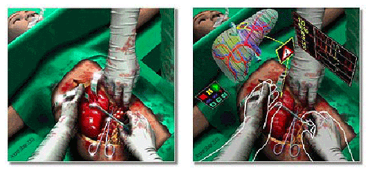 (7) ブラウン大学とノースカロライナ大学チャペルヒル校によって進められているプロジェクトでは、外科医をトレーニングするために、「テレイマージョン(遠隔没入)」技術が開発される。実物大の3次元グラフィックスで高忠実度の手術を再現し、訓練生が学習のために作業を中断したり、前に戻って作業を反復したりすることを可能にする。3次元グラフィックスによる手術の再現の様子を図2.3-1に示す。