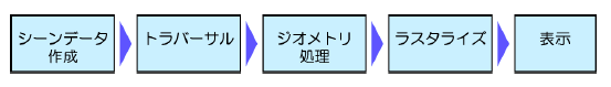 | (2) | トラバーサル シーンデータを解釈して必要な描画オブジェクトと描画命令を次段階へ渡す。 |