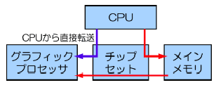 図 3.10-2に示すように、一般的にCPUで処理されたモデルのデータは、PCのメインメモリに保存されてからグラフィックプロセッサに転送される。そこで、メインメモリにデータを転送せずに、CPUから直接グラフィックプロセッサにデータを転送すれば、データ転送の高速化が可能になる。