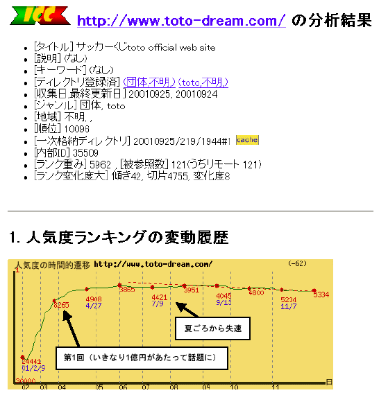 津田らは、リンク解析による人気度付与の時系列解析により、最近人気が出ているページなど、Webの動きを視覚化する研究を行っている[15]。図 3.12-1は、toto(サッカーくじ)のホームページの人気度(重みでソートした順位)の2000年2月から12月までの時系列的動きをプロットしたものである。3月の開始時点では、マスコミで取り上げられたこともあり、(ニュースサイトなどから)同サイトへのリンクも増え人気度が上昇している。しかし、夏くらいから頭打ちになり、段々人気度が降下していることがわかる。これは、人気度を順位でプロットしており、Webの拡大速度についていけなくなると、徐々に順位は落ちていくためである。