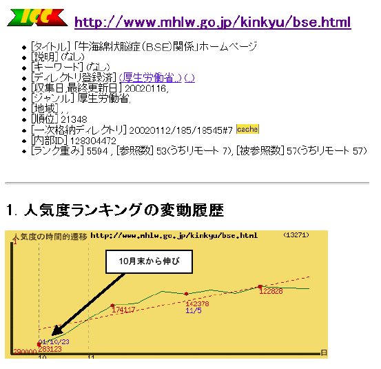 図 3.12-2は、2000年10月くらいから人気度が伸びている、厚生労働省の狂牛病(牛海綿状脳症、BSE: bovine spongiform encephalopathy)関係ページの人気度推移の例である。世間で問題になったのとほぼ時期を同じくして、同サイトへのリンクが増えていることがわかる。