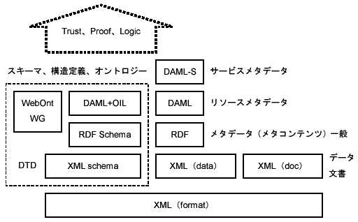| オントロジー・構造定義 | 自由(SHOE、お酒の箪笥など、独自の試みはある) | RDF Schema/XML、 DAML + OIL |